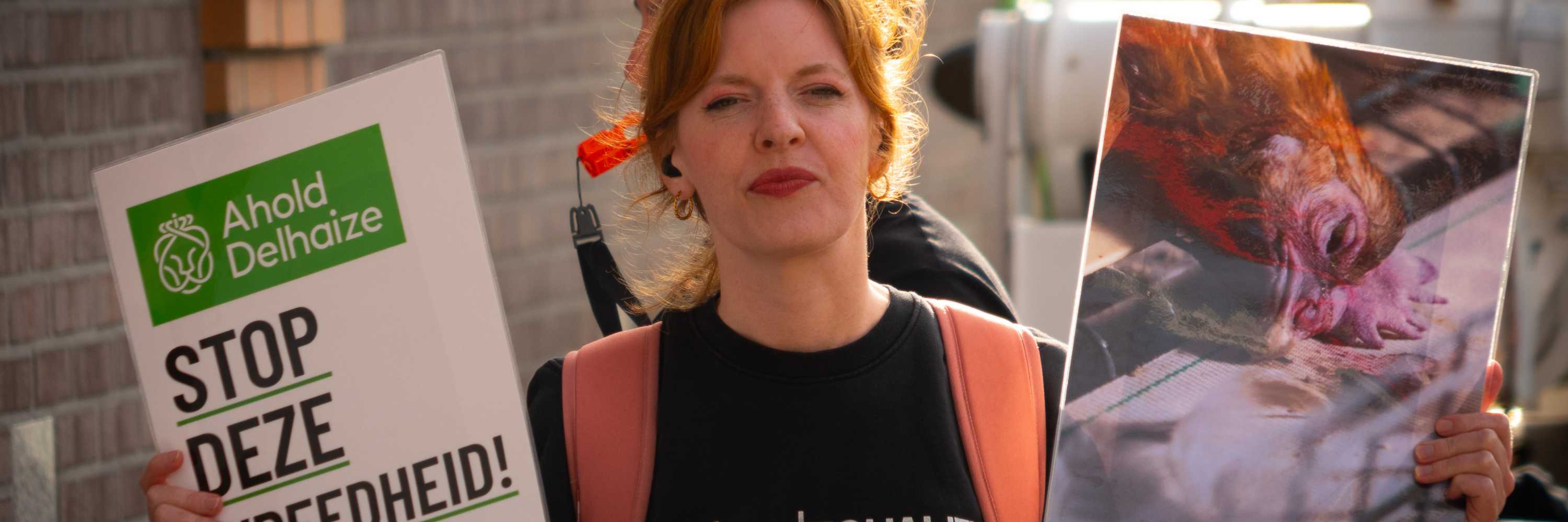 Daniela Fiegel, Coordinadora de Campañas de Igualdad Animal en Alemania, fue agredida durante una protesta pacífica frente a la sede central de Ahold Delhaize en Ámsterdam. La acción formaba parte de una campaña internacional que busca poner fin al uso de jaulas para animales en la cadena de suministro de la compañía.