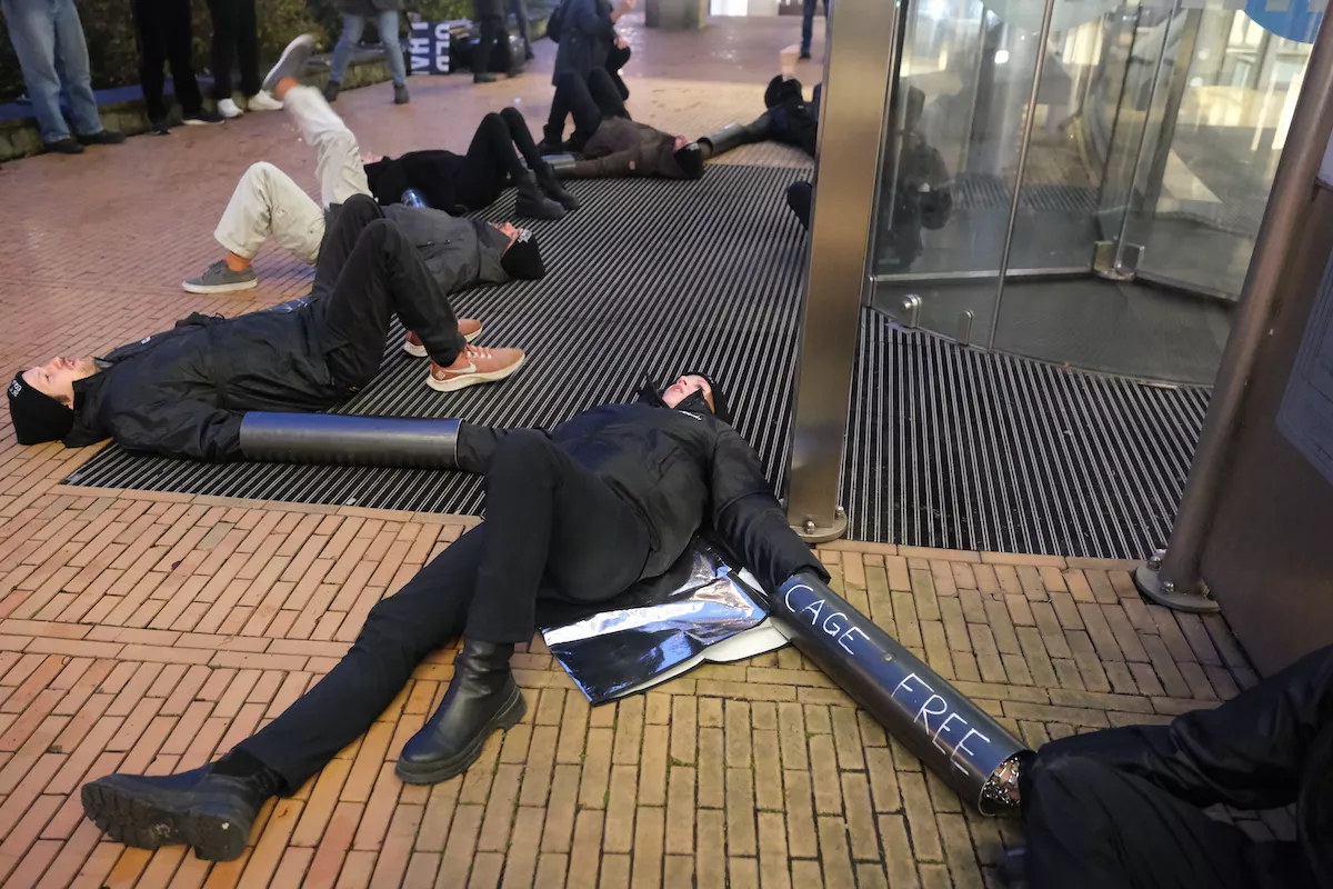 Activistas se encadenan a la sede central de Ahold Delhaize para protestar por las gallinas enjauladas