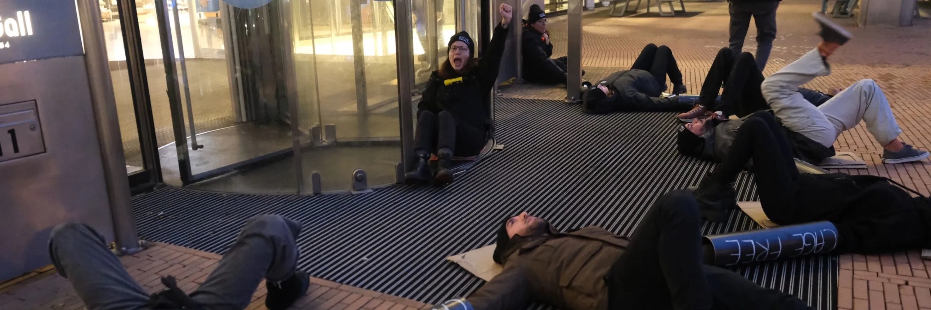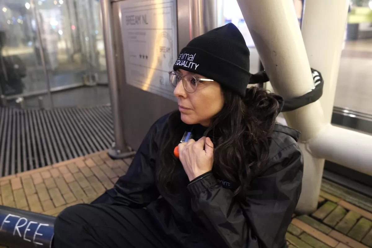 En la madrugada del 26 de noviembre, activistas de Igualdad Animal se encadenaron a la entrada principal de la sede mundial de Ahold Delhaize en Zaandam. La manifestación, que duró más de cuatro horas, exigía al gigante de la distribución alimentaria que cumpliera por fin su compromiso público de eliminar las jaulas para gallinas.