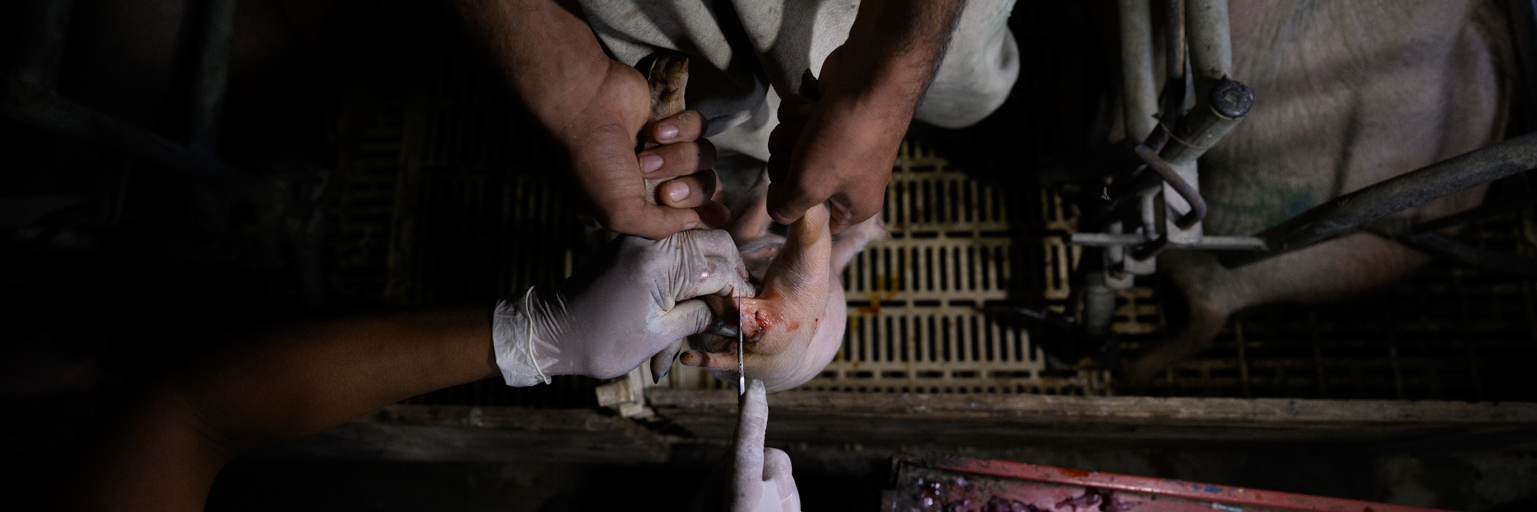 - Mutilaciones como castraciones, corte de dientes e identificación con aretes de cerdos realizados sin anestesia. El propio Manual de Bienestar Animal del Senasa señala que “Los animales no deben sufrir dolor” durante el manejo, maniobras zootécnicas, intervenciones quirúrgicas o la matanza.