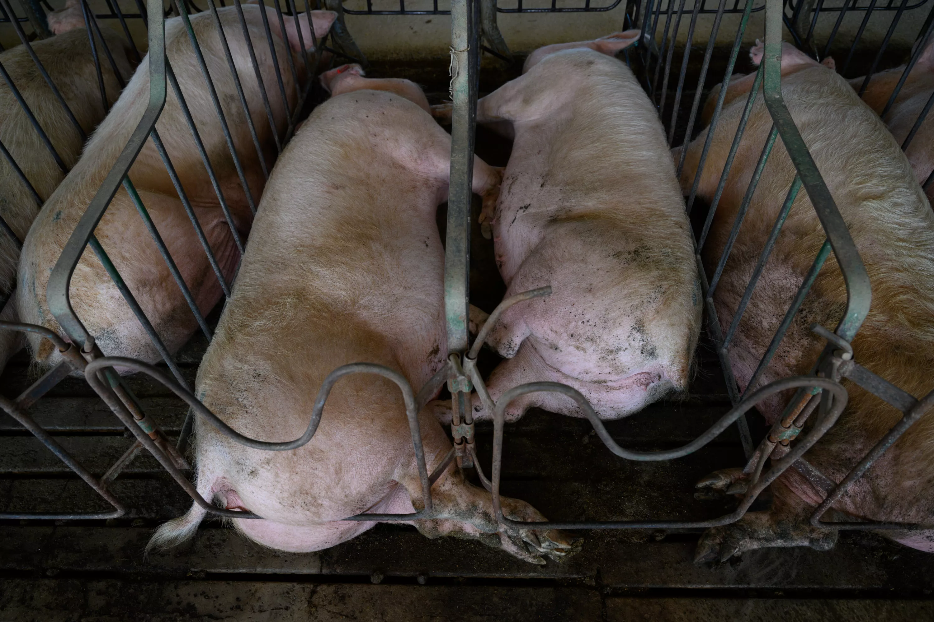En su investigación, Igualdad Animal también denunció el uso sistemático de jaulas de gestación y maternidad, donde las cerdas son confinadas sin que se les permita moverse, girarse sobre sí mismas, con suelos de concreto y barrotes de metal que les generan heridas, además del estrés crónico a consecuencia del hacinamiento ininterrumpido sin ningún tipo de enriquecimiento.